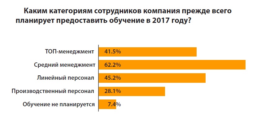 В 2017 году особое внимание компании (более 60% опрошенных) планируют уделить обучению менеджеров среднего звена. Это неудивительно, ведь именно мидл-менеджмент должен в равной степени обладать и профессиональными, и управленческими компетенциями, уметь грамотно управлять своими подчиненными и в то же время выполнять KPI и задачи, поставленные руководством компании.