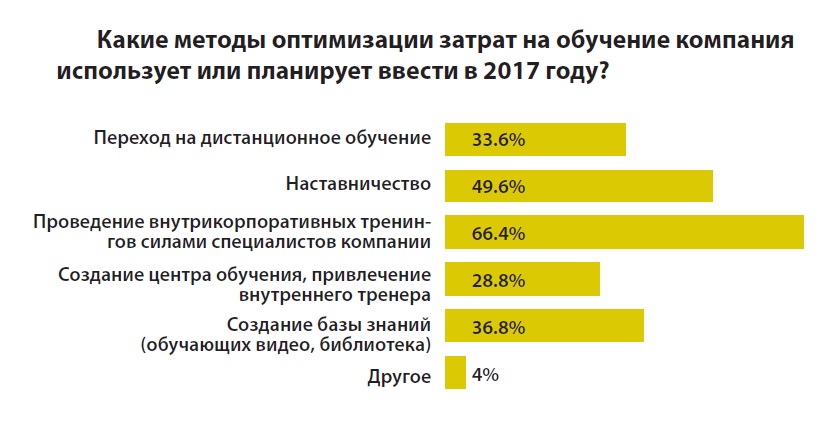 Однако в непростые для бизнеса времена многие компании задумываются и о том, как оптимизировать процесс обучения. На первое место сейчас выходит обращение к собственным ресурсам – создание баз знаний (36,8%), развитие систем наставничества (49,6%) и проведение внутрикорпоративных тренингов силами специалистов компании, уже прошедших обучение в бизнес-школах (66,4%).