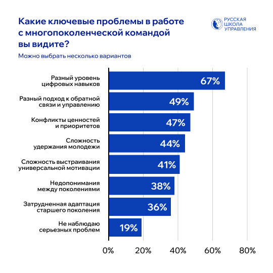 При этом только 19% участников исследования заявили, что не видят серьезных проблем в совместной работе поколений — то есть в большинстве компаний столкновение подходов к труду, коммуникации и развитию всё же существует.