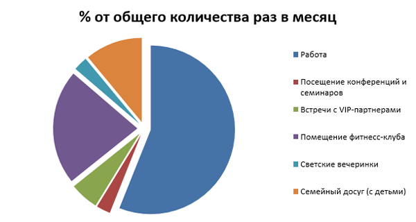 - После этого рисуем круг (круговую диаграмму), в который вносим сегменты вашей жизни, для которых нужны определенные стили одежды. После такой экспресс-диагностики, вам станет понятно, что, например, большая часть вашей жизни проходит на работе, периодически вы участвуете во встречах с очень важными партнерами (где ваш гардероб должен быть безупречен), вам необходима спортивная одежда для посещения фитнесс-клуба, модная/вечерняя одежда для светских тусовок и спокойная casual одежда для семейного досуга.