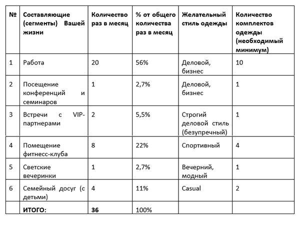 С первого взгляда, такой анализ может показаться несерьезным, и многие поленятся его сделать и не будут тратить время. Но именно в этом случае («Да я все и так знаю, куда я чаще хожу!») можно попасть в ловушку самоуверенности. Без чёткого расчета, из каких фрагментов состоит ваша жизнь, создать рациональный гардероб будет очень сложно, затратно с точки зрения не только материальных и временных ресурсов, но и с точки зрения нервов! Таким образом, не покупая ненужных вещей (например, очередные джинсы, хотя фактически необходимы брюки, чтобы носить с сорочкой), вы экономите деньги в своем личном бюджете. Ваша уверенность в себе растет от осознания того, что вы каждый день одеты стильно и уместно ситуации, и в вашем гардеробе есть необходимое разнообразие вещей под все события вашей жизни.